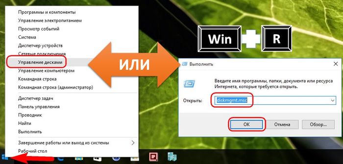 Для определения жестких дисков воспользуемся терминологией самой Acronis True Image. Жесткий диск, откуда будут скопированы данные и структура разделов – это исходный жесткий диск. Диск, который станет клоном исходного – это целевой жесткий диск. Увидеть наглядно исходную картину дисков в нашем случае поможет утилита управления дисками, штатный инструмент Windows. Быстрый доступ к ней в версиях системы 8.1 и 10 реализован в контекстном меню на кнопке «Пуск». Универсальный способ ее запуска – вызов функции «Выполнить» (клавиши + R), ввод команды diskmgmt.msc и нажатие Enter.