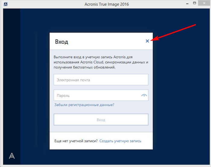 После запуска True Image 2016 предложит выполнить вход в учетную запись облачного хранилища Acronis. Можем закрыть окошко входа.