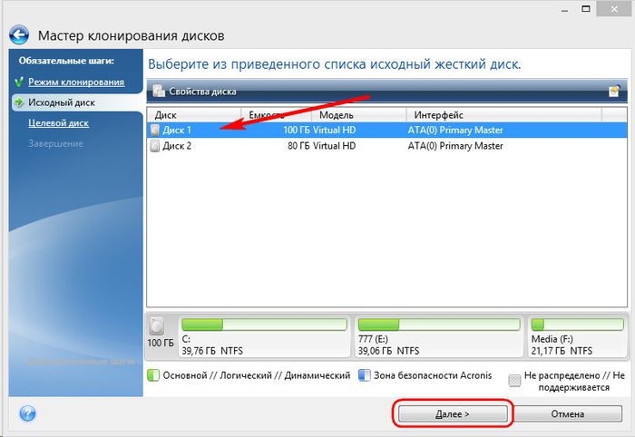 Окно выбора исходного жесткого диска: здесь делаем клик мышью, соответственно, на том диске, с которого будут переноситься данные. Нумерация дисков в True Image отличается от нумерации штатной утилиты Windows, потому в обозначении дисков лучше ориентироваться по их объему или модели. Жмем «Далее».