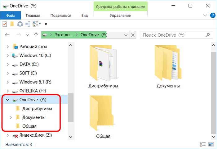 После подключения OneDrive в качестве сетевого ресурса он станет доступным в числе устройств и дисков раздела «Этот компьютер». Чтобы не портить вид системного проводника нечитабельными символами сетевого адреса, только что подключенный диск можно переименовать, вызвав на нем контекстное меню и выбрав соответствующую команду или просто нажав клавишу F2.