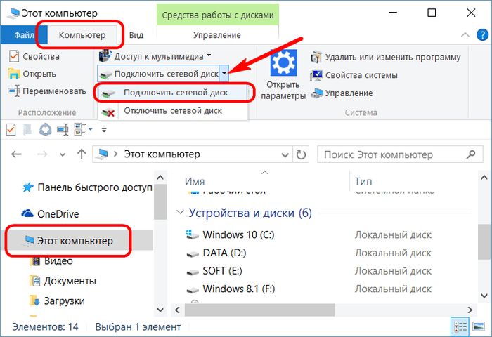 Для подключения OneDrive в качестве сетевого диска необходимо в области навигации проводника Windows выбрать «Этот компьютер», переключиться на горизонтальную вкладку «Компьютер» и нажать команду «Подключить сетевой диск» (она также доступна в контекстном меню).