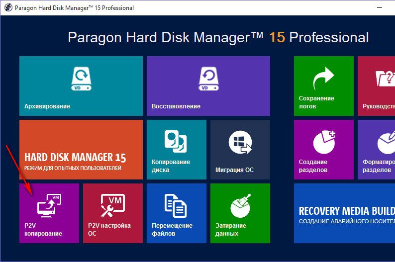 Paragon Hard Disk Manager 15 по умолчанию запускается с упрощенным видом интерфейса по типу начального экрана Windows 8.1. В окне этого интерфейса выбираем плитку с надписью «P2V копирование».