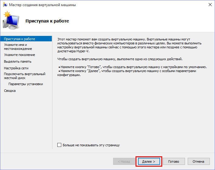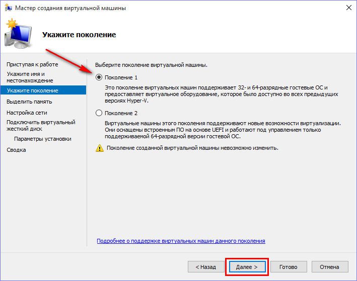 В нашем случае программой Paragon Hard Disk Manager была создана виртуальная машина поколения 1. Выбранное при виртуализации поколение указываем и в процессе добавления виртуальной машины в диспетчер Hyper-V. Снова жмем «Далее».