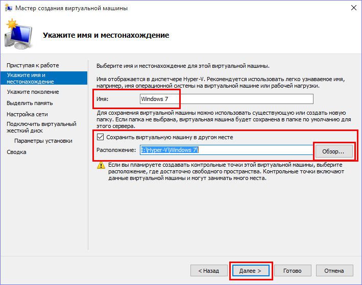 Вводим имя, которое будет отображаться для виртуальной машины в диспетчере Hyper-V. Выставляем галочку сохранения в другом месте и с помощью кнопки обзора указываем папку с файлами хранения виртуальной машины. Жмем «Далее».