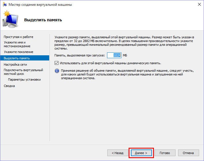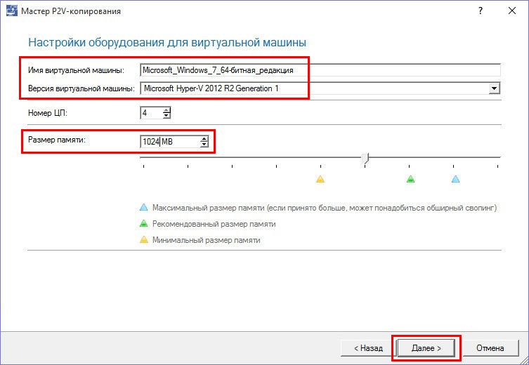 Размер оперативной памяти по умолчанию – 1024 Мб. Жмем «Далее».