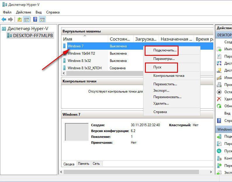 Все – виртуальный клон компьютера в диспетчере Hyper-V теперь можно запускать и подключать для управления.