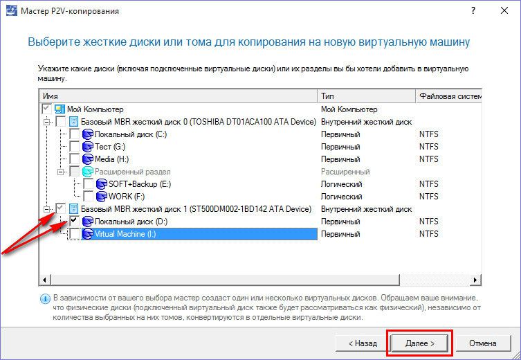 Затем увидим окно с представлением дискового пространства компьютера. Здесь необходимо выбрать разделы диска компьютера, которые превратятся в разделы диска виртуальной машины. В нашем случае отметим галочкой выбора только системный раздел на втором жестком диске, где установлена система Windows 7. В обязательном порядке галочку нужно ставить и на загрузочную MBR-запись. Сделав выбор, жмем «Далее».
