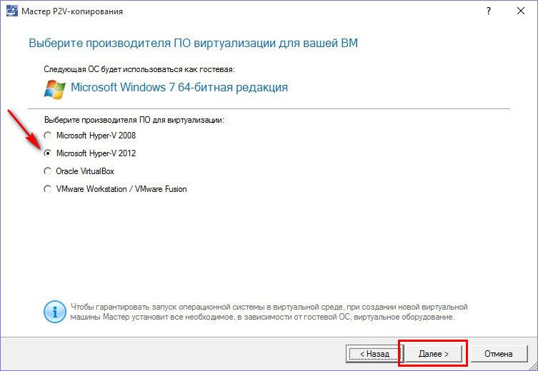 Следующее окно программы предложит на выбор несколько гипервизоров, включая две версии Hyper-V. В нашем случае выбираем последнюю версию – пункт «Microsoft Hyper-V 2012», поскольку эта версия совместима со штатным гипервизором Windows 10, где с виртуальной машиной и будет проводиться работа в дальнейшем. Жмем «Далее».