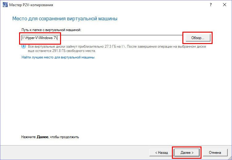 Используя кнопку обзора в конце строки, указываем место на диске компьютера, куда будут помещены файлы виртуальной машины.