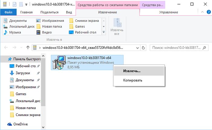 - для 64-Bit: msiexec /a c:tempwindows10.0-kb3081704-x64.msi /qb TARGETDIR=c:temp2