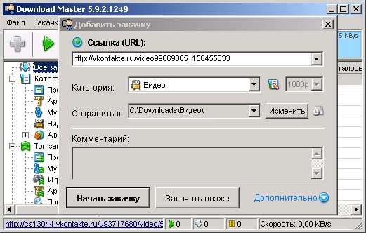 После установки , запустите программу и укажите скорость своего интернет соединения ( из предложенного списка ). Дальше , открываем страницу Вконтакте с понравившимся нам роликом и копируем ссылку с адресной строки браузера в буфер обмена ( выделяем мышкой ссылку и выбираем копировать). Открываем Download Master и в окне программы нажимаем значек + , а потом кнопку начать закачку. Все . Ждем пока скачается видео.