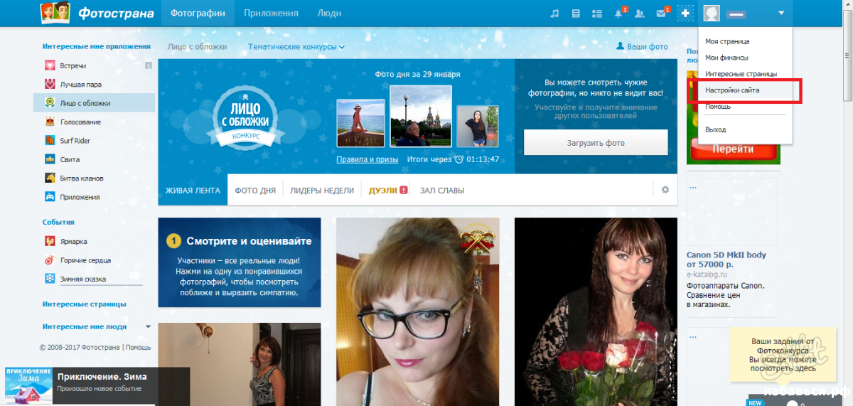 1. Откройте в любом браузере сайт «Фотострана» и зайдите на личную страницу.