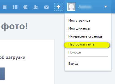 2. В верхнем меню профиля возле вашего имени справа расположен значок в виде маленького треугольника. Кликните по нему, а когда откроется ниспадающее подменю, выберете пункт «Настройки сайта».