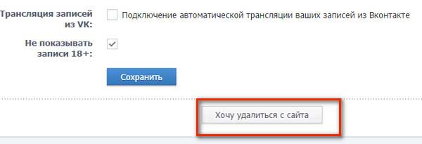 3. Прокрутите вниз список опций. Под ним находится кнопка «Хочу удалиться с сайта» — нажмите её.