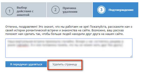 7. Перед тем, как окончательно убрать ваш профиль, «Фотострана» может попросить поделиться личными впечатлениями о знакомствах, встречах и т.д. Не озадачивайте себя особо этой просьбой. Достаточно будет и абстрактного ответа: что-то вроде «на то были свои обстоятельства» или «да, это было здорово».