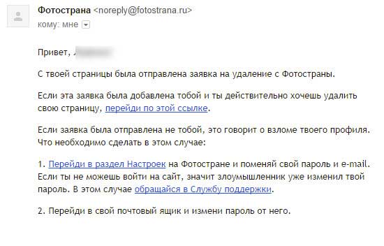 9. На email, указанный в вашем профиле, система соцсети автоматически отправит письмо с извещением об активации процедуры удаления. Откройте его и внимательно прочтите. Если вы по-прежнему хотите удалиться из социальной сети, подтвердите заявку, кликнув по ссылке «перейди по этой… ».