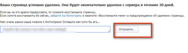 10. В браузере откроется сообщение, о том, что страница будет навсегда удалена с сервера по истечении 30 последующих дней. При желании вы можете отправить прощальный SMS «Фотостране»: тут же, на этой веб-странице, впишите в поле под текстом своё послание и кликните «Отправить».