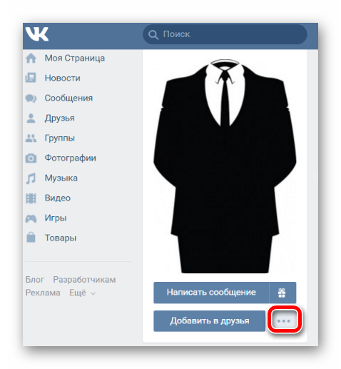 Значок многоточия под аватаркой - В открывшемся списке выбираем пункт «Заблокировать ********», где ******** — имя владельца профиля, вносимого в ЧС.