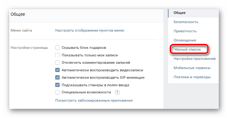- Справа видим знакомые разделы страницы, доступные для редактирования, выбираем пункт «Черный список»;