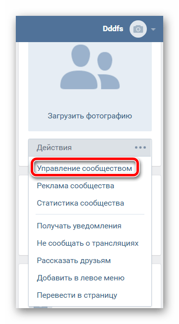 Значок открытия дополнительных параметров сообщества - В выпадающем списке выбрать пункт «Управление сообществом»;
