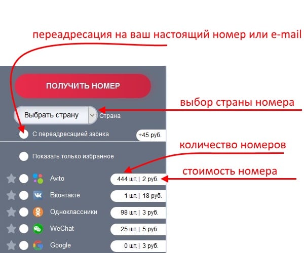 Выбор сервиса для аренды виртуального номера - Если необходимо, чтобы SMS из ВК приходило на вашу почту или мобильный телефон, выберите чекбокс «С переадресацией звонка». Обратите внимание, что переадресация не бесплатна и стоит 45 рублей. Если вы не активируете этот пункт, то сообщение можно будет найти на этом же сайте.
