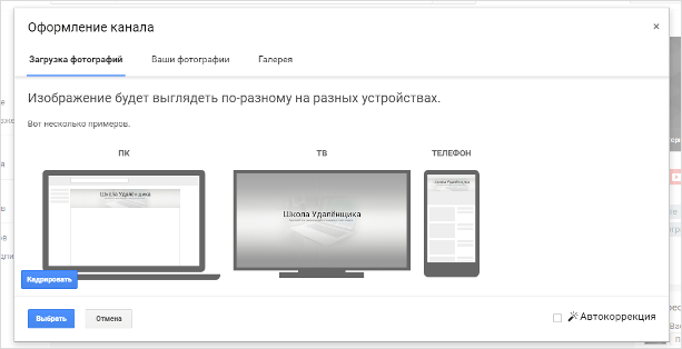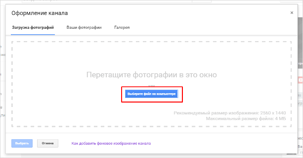 Изменяем оформление Ютуб канала - Загрузить изображение;
