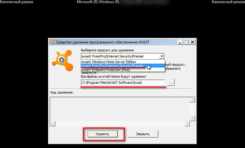 7. После перезапуска системы в выпадающем меню утилиты, выберете название продукта, который установлен (например avast! Free) и активируйте команду «Удалить».