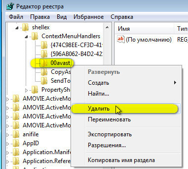 7. Проанализируйте результат поиска и удалите записи, содержащие в своём имени название антивируса (например раздел 00avast).