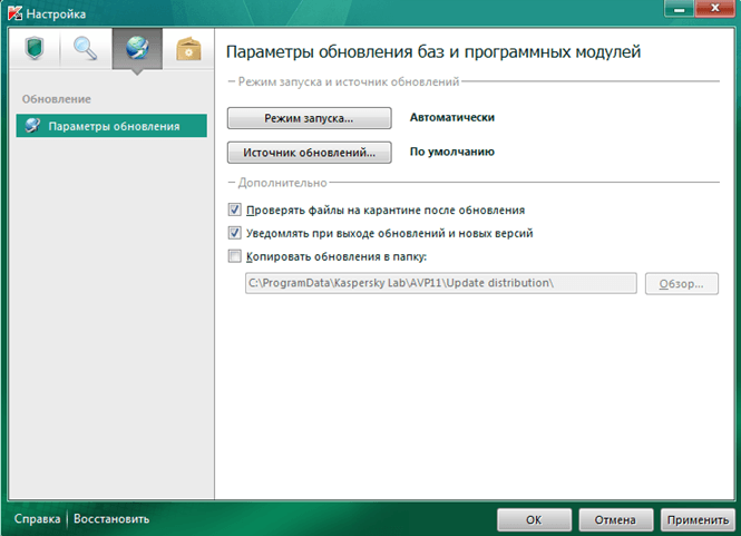 Здесь нужно убедиться, что антивирус Касперского обновляется автоматически. Рядом с кнопкой «Режим запуска» должно быть указано «Автоматически». Если это не так жмем на кнопку «Режим запуска» и устанавливаем автоматическое обновление.