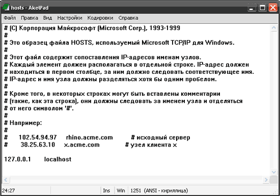 Во-первых, необходимо проверить файл hosts. Он находится в папке C:\WINDOWS\system32\drivers\etc. Это обычный текстовый файл. Открыть его можно с помощью стандартного Блокнота Windows. Каждая строка — это соотношение IP-адреса к доменному имени. В начале каждой строки располагается IP-адрес и через пробел соответствующее доменное имя. Введя название узла из второго столбца файла hosts, браузер обращается к IP-адресу из первого столбца той же строки. IP-адрес 127.0.0.1 обозначает локальный компьютер. Стандартный файл hosts выглядит следующим образом: