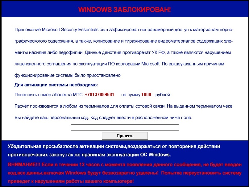 В сообщении обычно написано, что Windows заблокирован, доступ в сеть заблокирован, компьютер заблокирован, операционная система заблокирована за нарушение использования сети интернет или просмотр детского и гей-порно и т.д. Для разблокировки предлагают отправить СМС или пополнить счет мобильного телефона МТС или БИЛАЙН, номер которого указан на баннере.