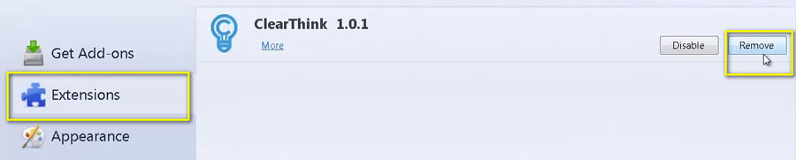 Удалите из ПК программы сомнительного происхождения: скринсейверы, виджеты, патчи и пр., в особенности те, которые были проинсталлированы недавно. Вероятнее всего, ClearThink проник в систему и, соответственно, в браузеры именно с ними. Проведите очистку Windows при помощи утилиты ССleaner, включая не только файловые директории, но и реестр.