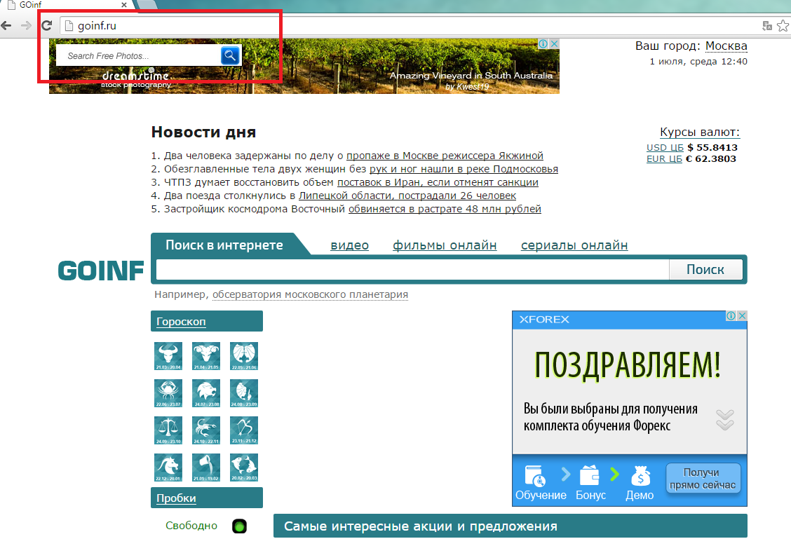 Как удалить Goinf из браузера и восстановить стартовую страницуHttp://goinf.ru/ — фейковая поисковая система. Внешне выглядит вполне прилично (традиционно для категории данных сайтов): и гороскоп, и курсы валют, и лента новостей, и видео. Только вот незадача: если сделать запрос в строке поиска Goinf, ничего он самостоятельно искать не будет, а только выполнит переадресацию на сторонний ресурс — «поиск@mail.ru».