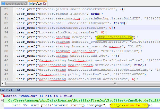 - все найденные системой файлы со словом «operaprefs» (как правило, они имеют расширение .ini), также откройте в блокноте и просканируйте на предмет каких-либо упоминаний о Webalta. Все найденные записи соответственно нужно удалить.