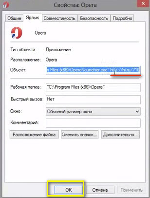 3. На вкладке «Ярлык», в поле «Объект», удалите ссылку после прописанного пути к исполняемому файлу. Например (для Opera): строка должна заканчиваться …Opera.exe”.