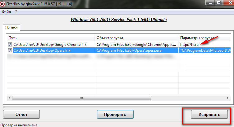 Если вы пользуетесь 3-5 браузерами (то есть нужно очистить несколько ярлыков), или вы не уверены, что сможете корректно удалить ссылки в свойствах вручную, воспользуйтесь специализированной утилитой FixerBro. Она проверяет и восстанавливает ярлыки практически всех браузеров (в т.ч. и менее распространённых, таких как Нихром, Амиго, SeaMonkey).