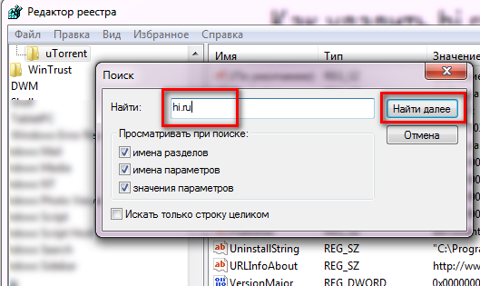 7. Чтобы продолжить поиск вредоносных записей, нажмите «F3».
