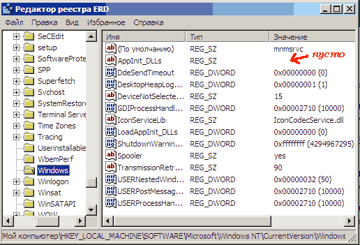 Если там прописан какой-то файл, скорее всего это вирус. Нужно щелкнуть два раза мышью на ключ AppInit_DLLs и стереть прописанный путь, оставив поле значения пустым, после чего нажать ОК.