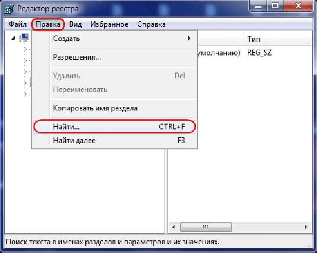 - выделяя нужную ветку, нажимаем комбинацию клавиш Ctrl+F, либо «Правка»->«Найти»;