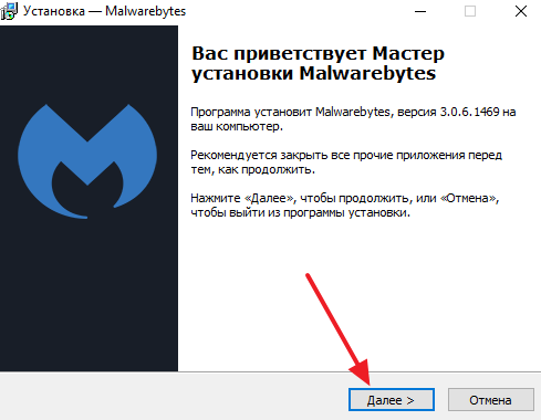 После этого запускаем скачанный файл и устанавливаем Malwarebytes Anti-malware на компьютер. Сам процесс установки очень прост и не требует никаких дополнительных комментариев. Просто нужно несколько раз нажать на кнопку «Далее» и согласиться с условиями.