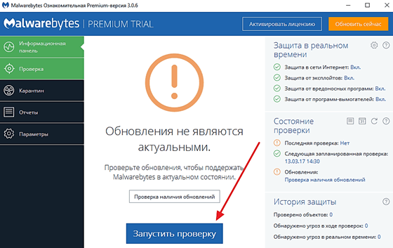Проверка компьютера с помощью Malwarebytes Anti-malware