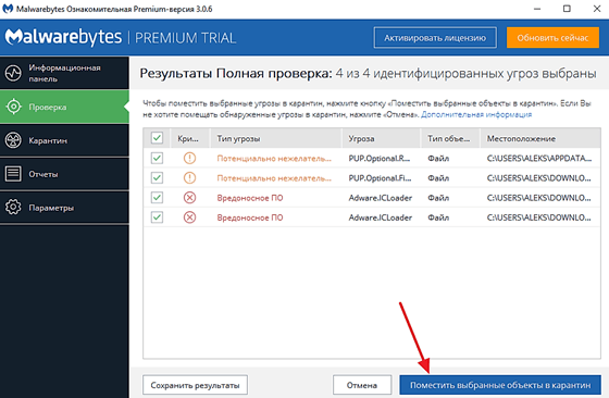 После этого нужно просто дождаться, пока программа Malwarebytes Anti-malware закончит проверку. После проверки Malwarebytes Anti-malware покажет список опасных файлов и предложит поместить их на карантин. Нажмите на кнопку «Поместить выбранные объекты на карантин» для того чтобы подтвердить это действие.