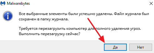 После помещения опасных вирусов на карантин, программа Malwarebytes Anti-malware предложит перезагрузить компьютер. Нажмите на кнопку «Да» для того чтобы подтвердить это действие.