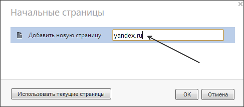 В текстовое поле под надписью «Домашняя страница» нужно ввести адрес страницы, которую вы планируете использовать в качестве стартовой. В нашем случае вводим «Yandex.ru» и сохраняем настойки нажатием на кнопку «ОК».