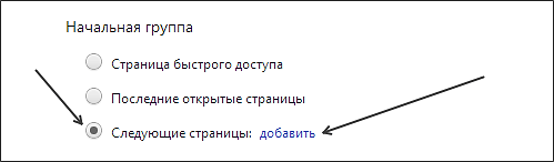 Для того чтобы сделать Яндекс стартовой страницей нужно выбрать пункт «Следующие страницы» и нажать на ссылку «Добавить». После этого перед вами откроется окно «Начальные страницы».