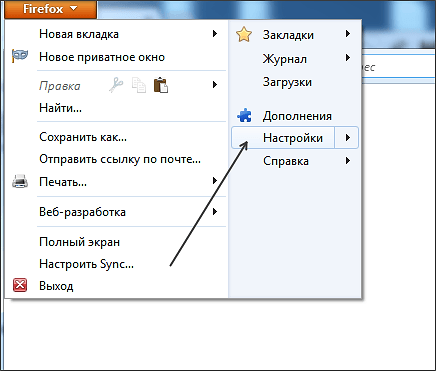 Следующий веб-браузер, который мы рассмотрим, это Mozilla Firefox. Для того чтобы установить стартовую страницу в Mozilla Firefox нужно запустить меню браузера и открыть его настройки. Для этого кликаем по кнопке Firefox в левом верхнем углу программы и выбираем пункт меню «Настройки».