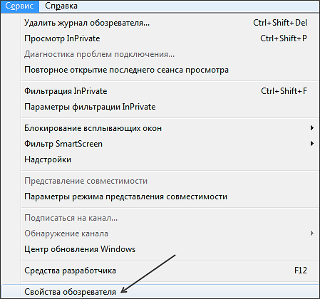 Для начала нажмите на кнопку ALT на вашей клавиатуре. При этом под адресной строкой браузера Internet Explorer появится стандартное меню «Файл, Правка, Вид, Избранное, Сервис, Справка». Откройте меню «Сервис» и запустите «Свойства обозревателя».
