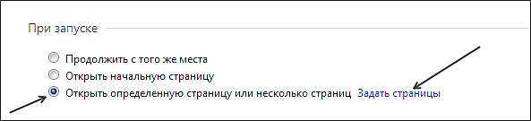 В открывшемся окне нужно найти функцию под названием «При запуске». Здесь нужно выбрать пункт «Открыть определенную страницу или несколько страниц» и кликнуть по ссылке «Задать страницы».