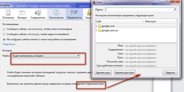 2. В разделе «История» (на вкладке «Приватность») в предложении «Возможно, вы захотите… » нажмите ссылку «удалить отдельные куки».