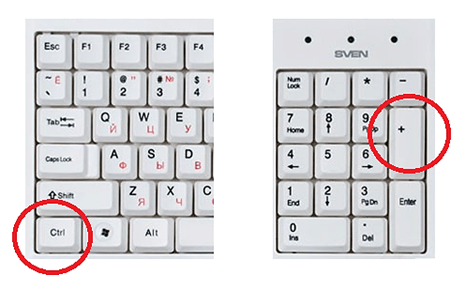 CTRL и клавиша «+» – зажав клавиши CTRL и «+» на вы увеличите шрифт в браузере. При этом пользователь может использовать клавишу «+» как на основной, так и на дополнительной (Num) клавиатуре.